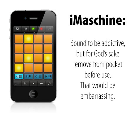 iMASCHIN 在10月1日在app store面世,有16 pad 的界面,MIXER,和400組不同的獨立採樣聲效, 還支援系統包括 iOS 4.3 ,iPod touch® 3G ,